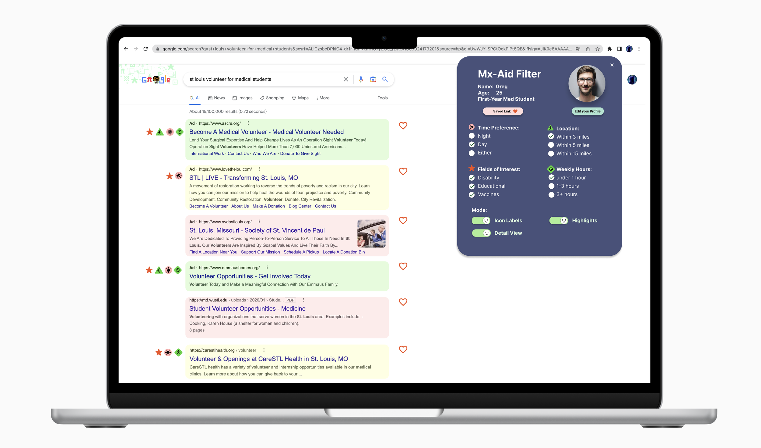 Our research revealed that while numerous opportunities exist, medical students often struggle with factors such as time management and finding the right organizational fit during their demanding academic schedules. This led us to design and prototype our final product: a Chrome extension (‘Mx-Aid Filter'‘) that streamlines the volunteer search process through intelligent filtering and compatibility indicators. (product presentation slides)